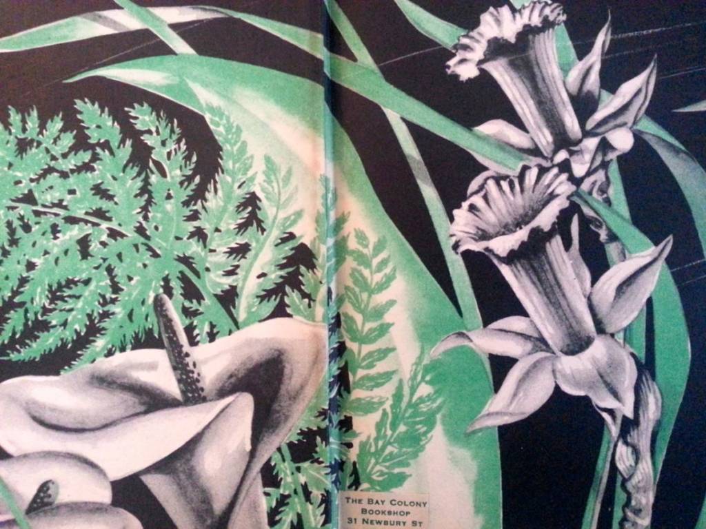 I open a book full of plant life and find in the text a depth to explore (an expedition metaphor of some sort – with the associations of goal and effort – seems appropriate). Heavy with facts and histories, the text engages in its own right, but I cannot claim knowledge as my aim. It’s seeing: e.g., the stark black and white woodcuts in Flora Exotica. The thick dark lines becoming plant and pattern made this volume mine; these images compelled me to buy the volume, to own them. Jacques Hnizdovsky’s prints pair with Gordon DeWolf’s text: floral biographies track the circuitous pathways of collection and commerce that brought each plant to European knowledge and market; the various curative properties and novel applications. I pick at the text in fits and starts but then: every few pages, the stunning binary of black line and negative space.