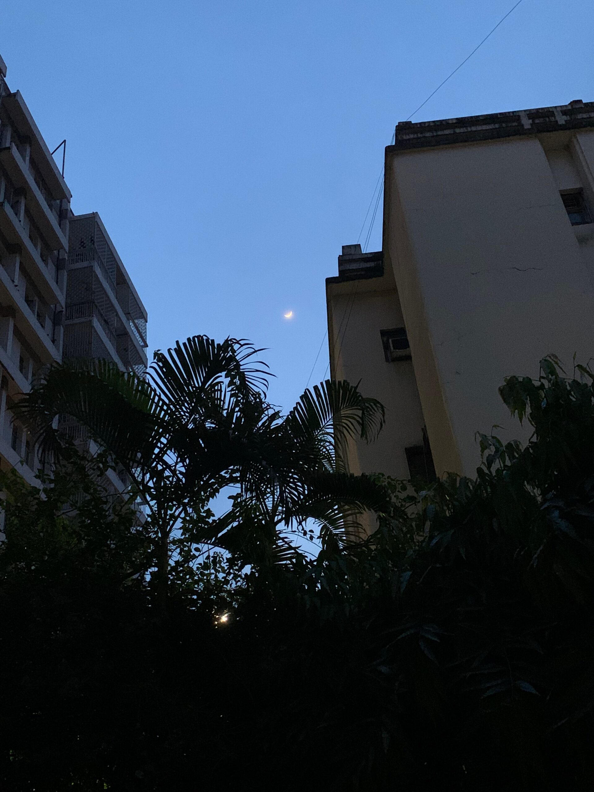 Pearlescent blue sky, shining from within. Ma and I walk